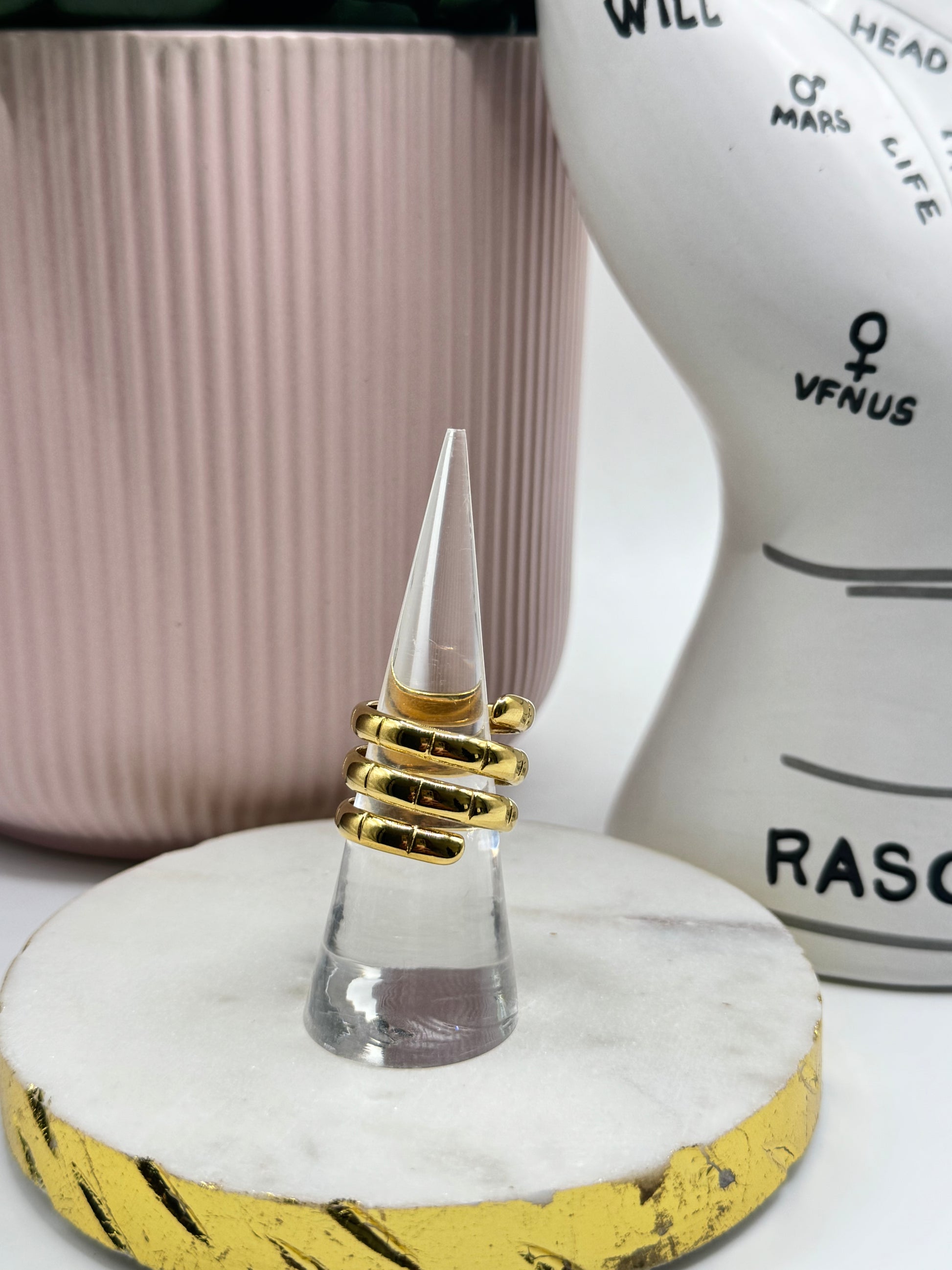 Elegante anillo abierto de capas elaborado en acero inoxidable. Baño de PVD en oro de 18 quilates y platino. Resistente al agua, moderno y elegante.